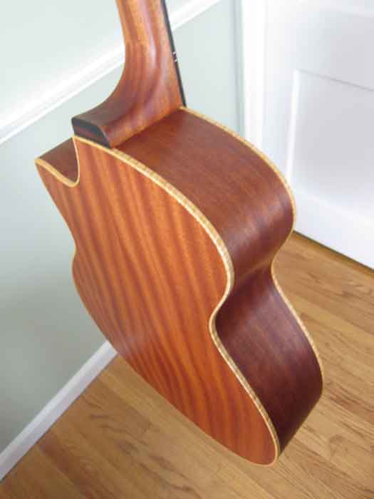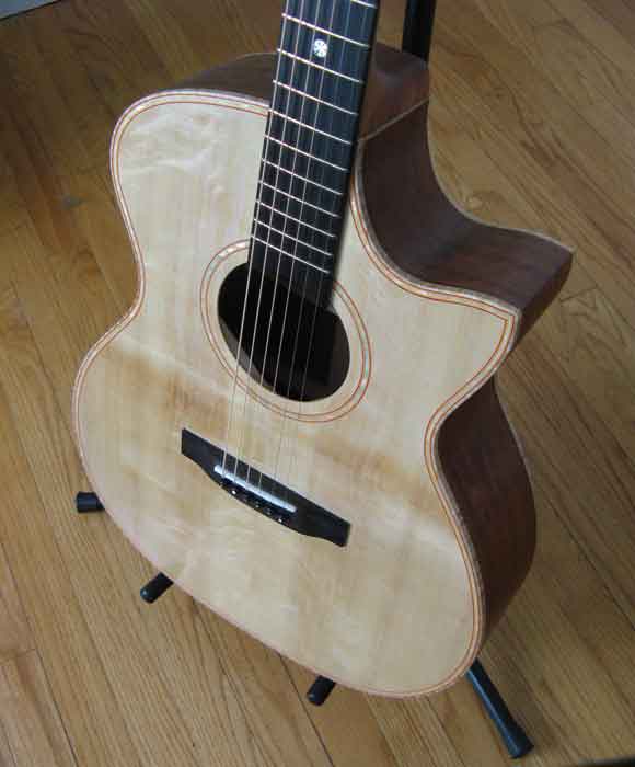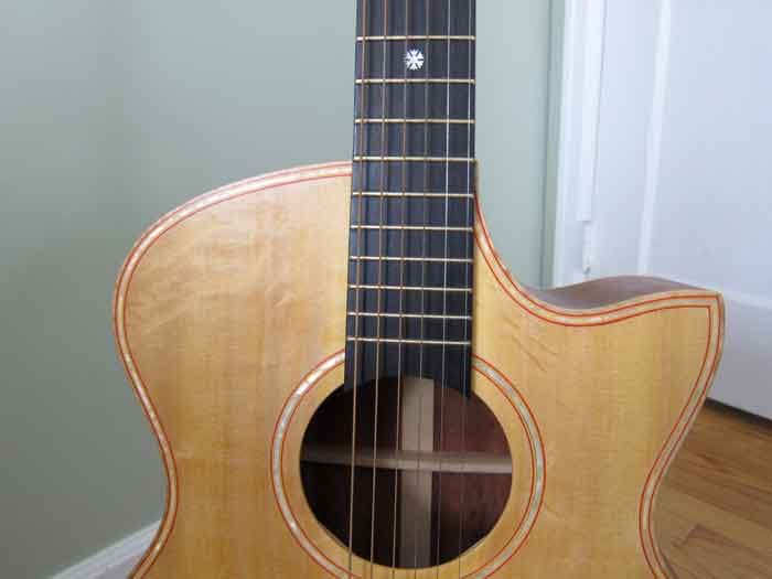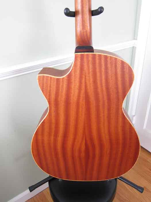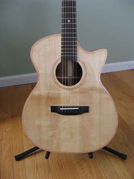 Jumbo size with cutaway. Hand rubbed oil finish. Easy playing shallow profile neck.